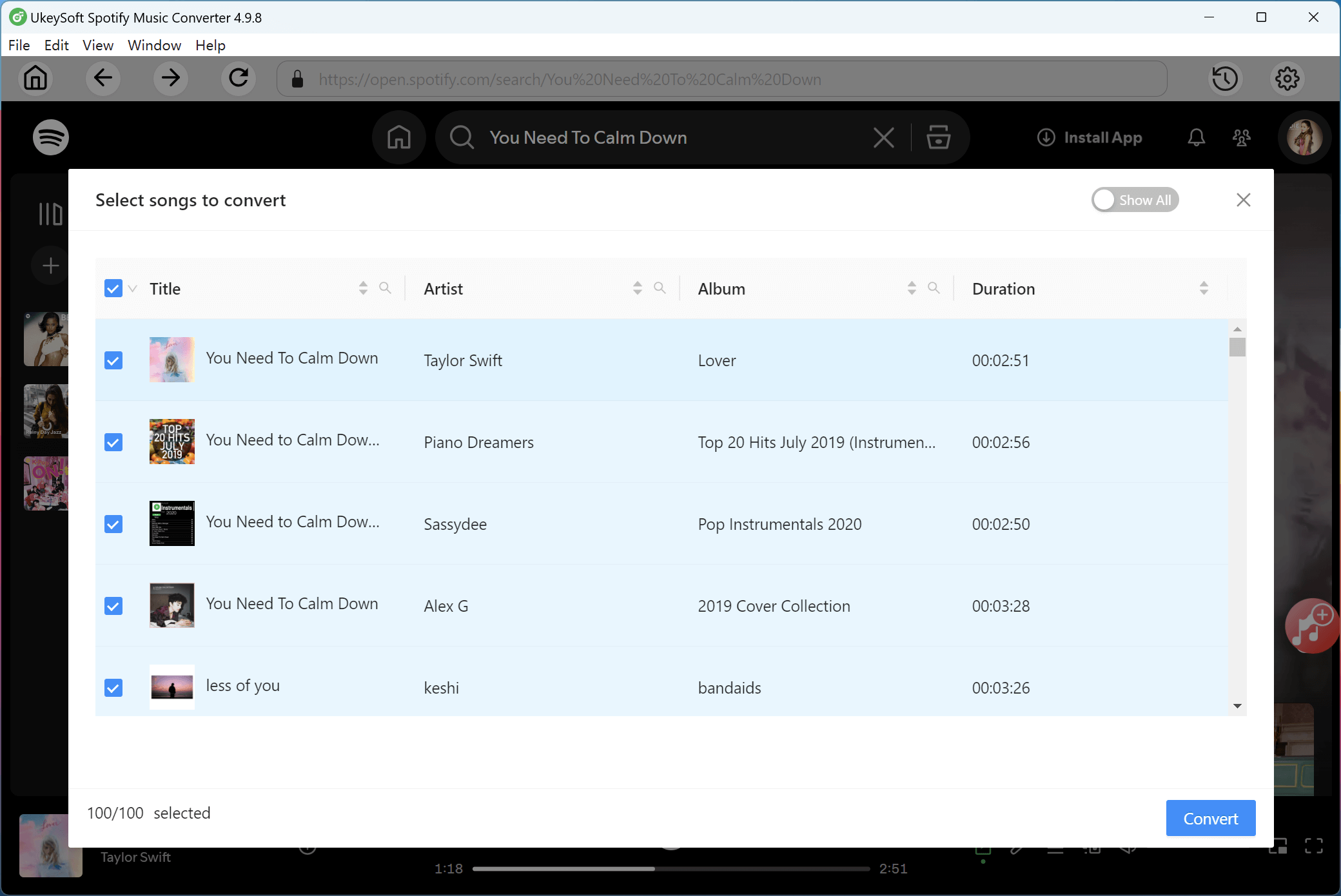 Here are 3 different ways to download Taylor Swift's You Need To Calm Down from Spotify to MP3. By comparison, UkeySoft Spotify Music Converter is highly recommended. With it, you can download multiple songs, albums and playlists from Spotify to MP3 without premium high-quality. It supports both Spotify Free and Premium users, offers various output formats and high efficiency. After downloading Spotify music to MP3, users can keep the music files forever and transfer them to any MP3 player, iPod, phone, USB drive and more devices. You can give it a try right now!